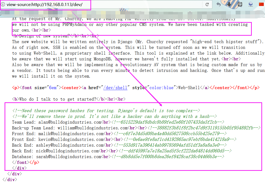 (1) 可暴破出dev页面,该页面源码里面有多个账号的用户名、邮箱、密码sha1值。该页面还链接到webshell命令执行页面。