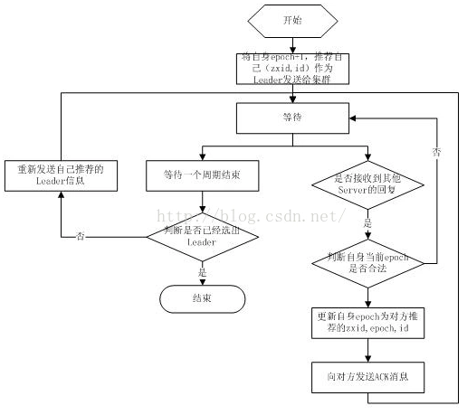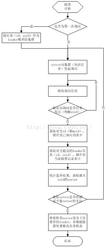 (1)选举线程由当前Server发起选举的线程担任,其主要功能是对投票结果进行统计,并选出推荐的Server;