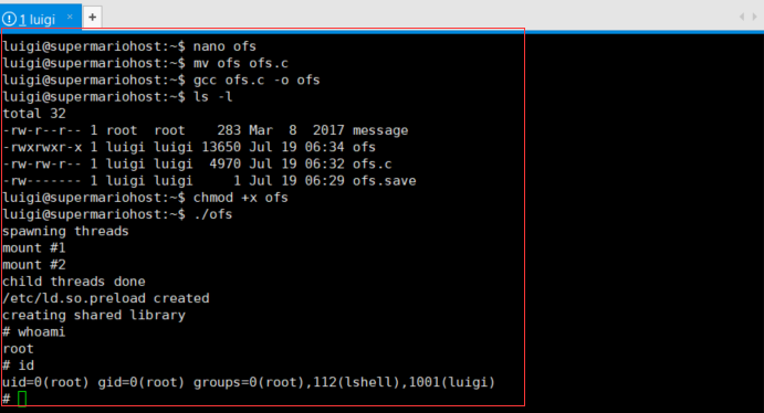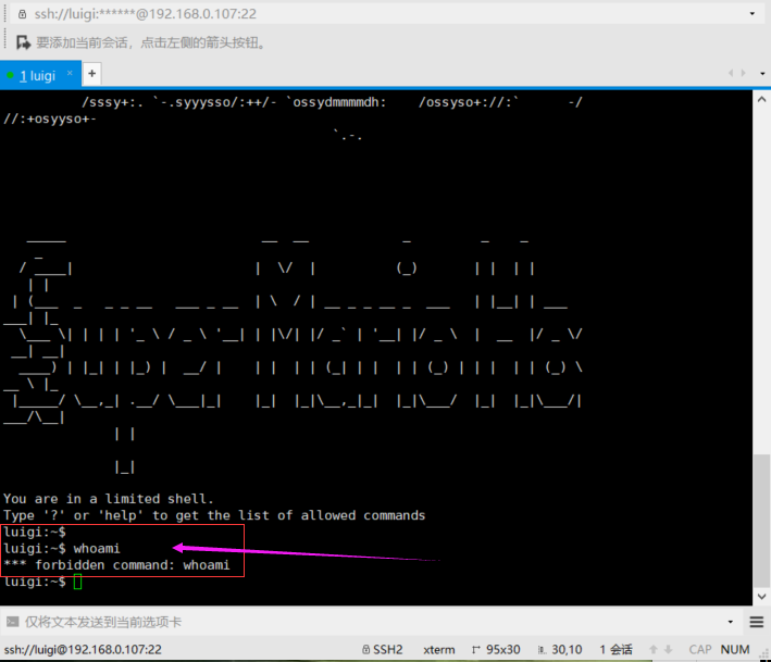 不过luigi用户被困在一个有限的shell中,只有awk,cat,cd,clear,echo,exit,help,history,
