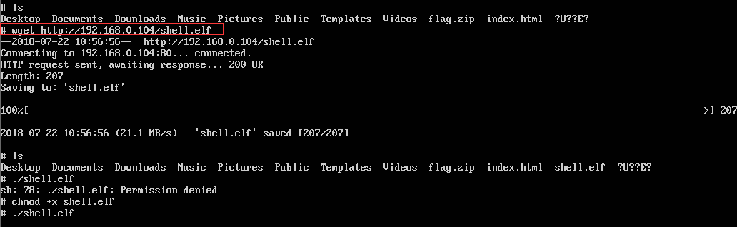 然后我们在靶机上,下载下来这个刚生成的shell.elf(也就是后门)