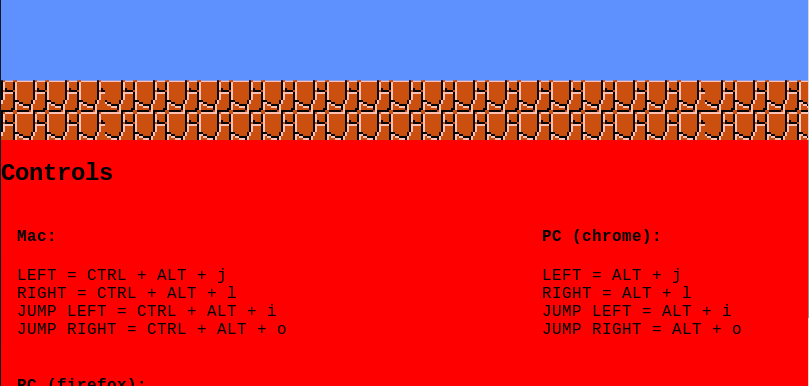 真是太美了,Maaaaario!欢迎来到超级马里奥主机!我和我的大兄弟有一个想法,为这台机器致敬,我们仍然试图找出做什么,让你娱乐!在此期间,你可以玩这个漂亮的游戏,我已经为你添加:D学分到Mark Robbins,游戏的源代码可以在这里找到。
