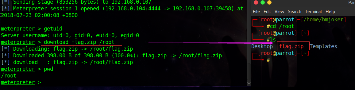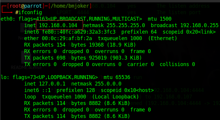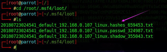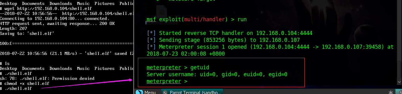 运行后门shell.elf,就会发现parrot这边的监听已经有反应了
