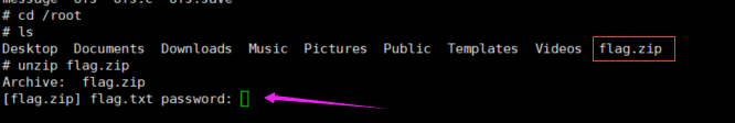 我们进入/root目录下,发现一个flag.zip的压缩文件,解压还需要密码: