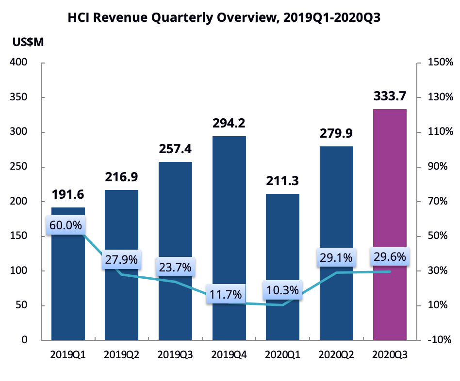而HCI,2020年前三个季度整体增长率18%,20Q3增幅约30%,没有SDS增长那么快。