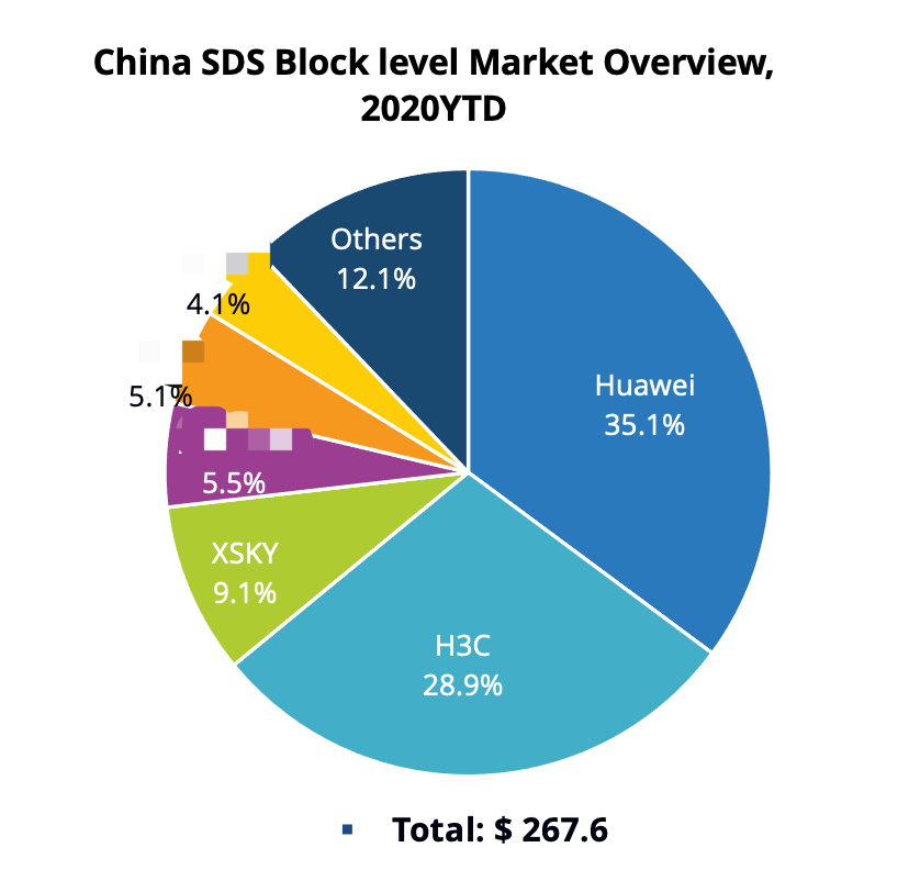 分布式块的TOP3厂商是Huawei、H3C和XSKY。前两名都是服务器厂商。