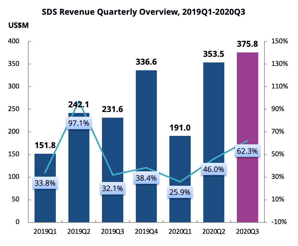 SDS在2020年前三个季度的整体涨幅是47.1%,其中20Q3出现井喷行情,市场增幅高达62.3%。
