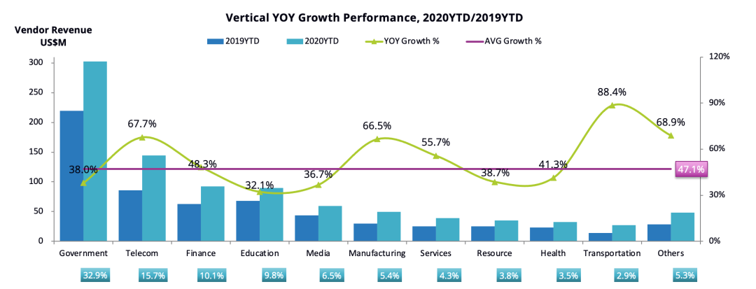 从行业的情况看,政府、电信、金融是TOP3行业。