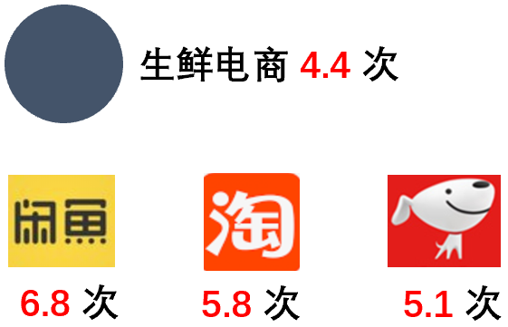 根据Trustdata数据,2020年2月份,生鲜电商头部app的日均打开次数是4.4次,而闲鱼、淘宝和京东的日均打开次数早在2016年就远远超过4.4。