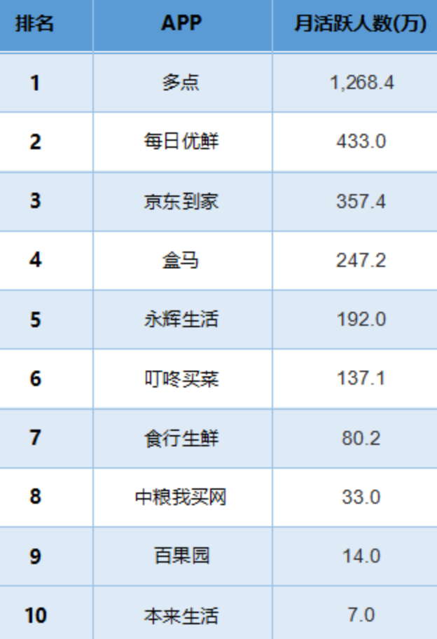 根据易观咨询数据,截至19年8月份,生鲜电商的月活跃top10如下