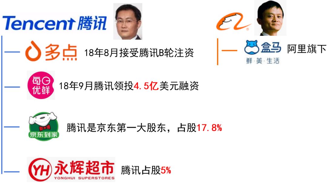 腾讯的核心是其强大的社交属性和流量,其对生鲜电商的界入以参股和支持为主,这种支持主要是资金和数据支持,通过庞大的社交数据赋能提高生鲜电商供应链的效率。