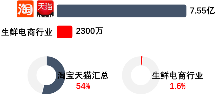根据易观咨询的数据,截至19年8月,淘宝天猫的合并月活跃用户数是7.55亿,占14亿人口的54%,而生鲜电商整个行业的月活跃用户数才2300万,仅占总人口的1.6%。