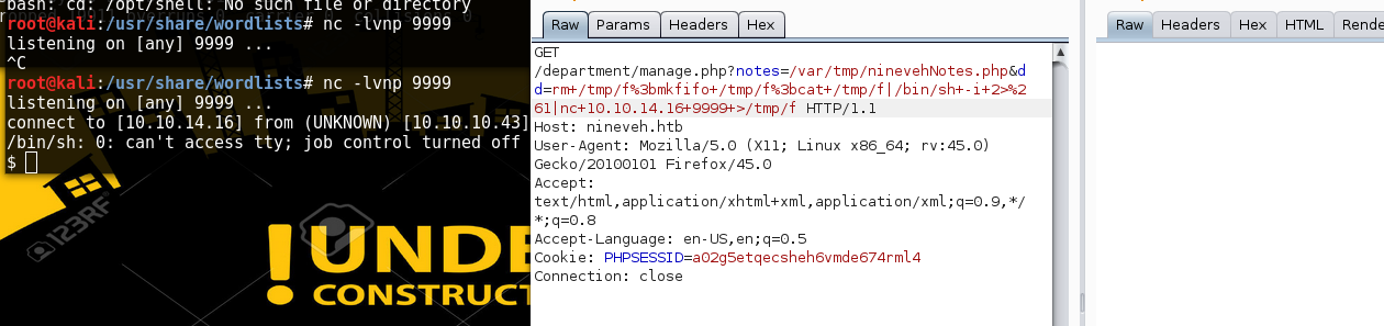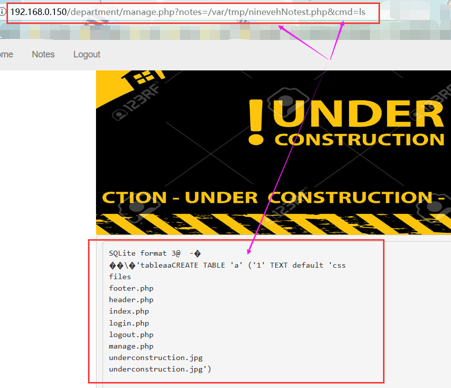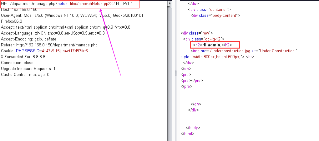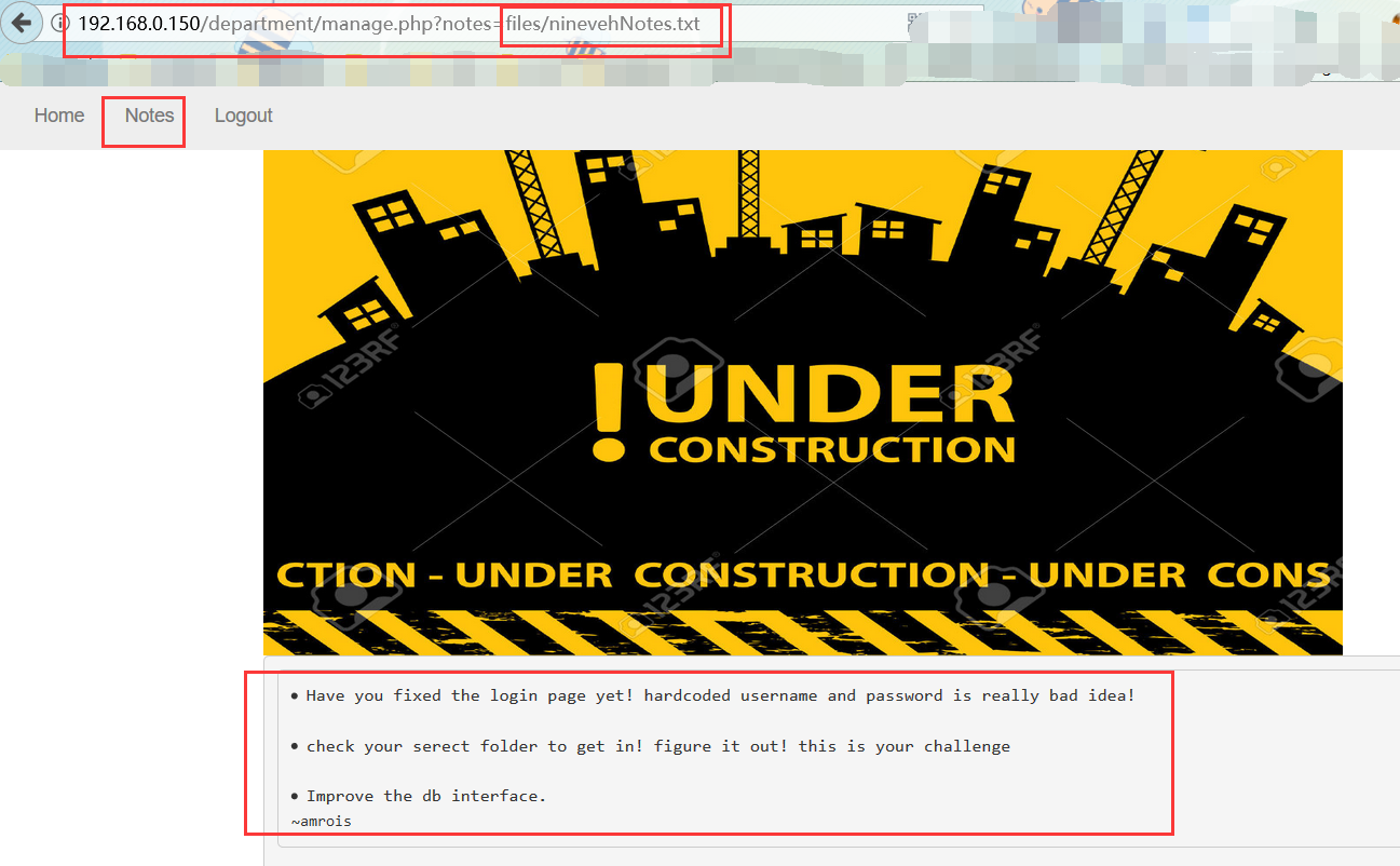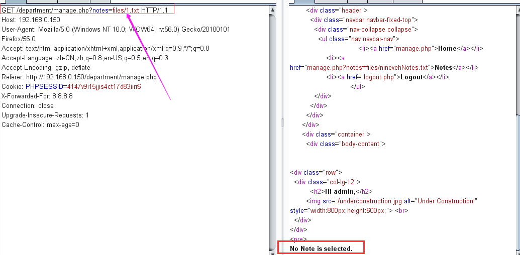 登录在 http://192.168.0.150/department/manage.php?notes=files/ninevehNotes.txt 是一个简单任意文件读取,但是这里的读取文件是被写入白名单里的,就是它只能读取结尾带 ‘ ninevehNotes ’ 的文件,测试如图: