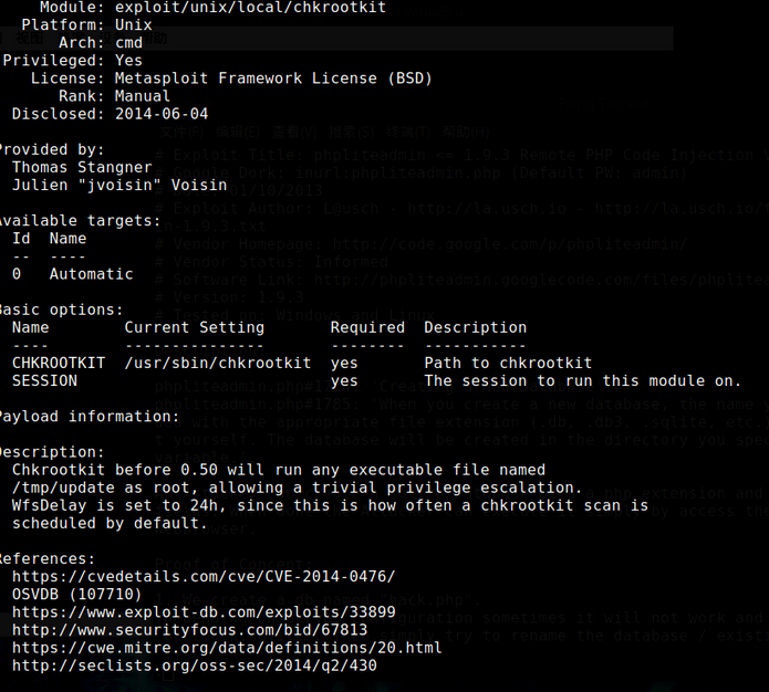 通过查看其版本号和配置信息结合google搜索,发现一个本地提权漏洞,而MSF也已经有该利用脚本,如图: