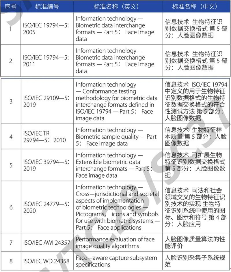 国际标准化组织和其他国外先进标准组织人脸识别相关的标准统计情况见下表。