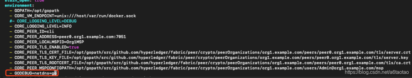 在 docker-compose-cli.yaml 中 cli 容器下,添加环境变量 GODEBUG=netdns=go,在 base/peer-base.yaml 中 peer-base 容器下,添加环境变量 GODEBUG=netdns=go