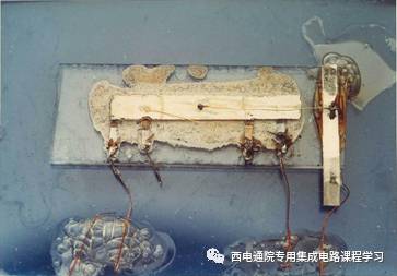 既然能用单一材料硅制作这些分立器件,就能把这些器件做在一起。基尔比立即行动起来了。当时的TI,已有了几种锗器件。并能把把金属蒸发在锗管的发射极和基极上,再用蚀刻技术做成接触点,然后连接起来。基尔比得到了几张这样的锗晶片,他决定用它们做两个电路。他先在锗晶片上制造出三极管,然后在纯锗晶体中少量掺杂做成电阻,最后用反向二极管做出电容,再用金线将它们连成一个Phase-ShiftOscillator。两个助手把制成的电路切割成0.12x0.4英寸大小的成品。