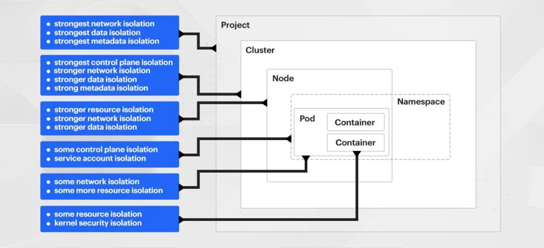 从根本上说,Kubernetes 是为工作负载编排而设计的——信任并不是 Kubernetes 中封装或部件产生的原因;多租户的目的是为了打包,而不是为了支持拓展权限边界。它提供了几个层,你可以选择在其中为不同的可执行性设置适当的边界。其中一些边界是内置的,而其他边界只是用于集成其他工具来辅助管理的集成点。下面是用于隔离工作负载的一些原语,有的 Kube 提供了,有的没有提供。