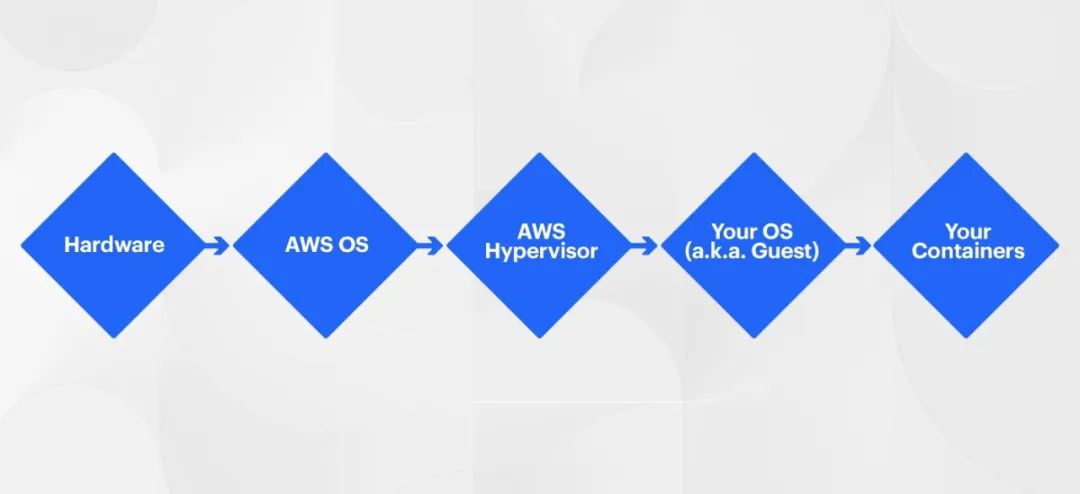虚拟化的概念是指能够在一个 OS 虚拟化系统] 上运行多个容器。容器只能看到授权给它的设备 / 资源。在 AWS 这样的托管计算平台上,你实际上是运行在一个管理程序之下,它管理运行你的操作系统和容器的 VM。