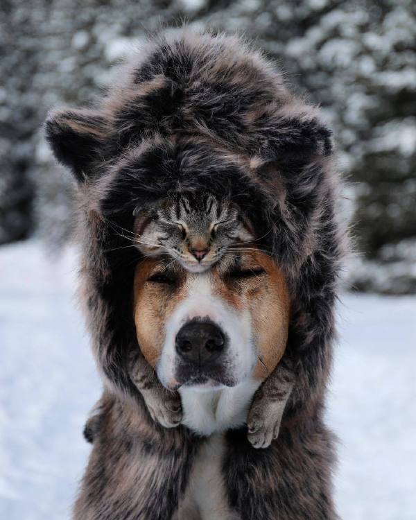 “猫 我会想念大熊的 狗 我也是,还好有他,我们才能熬过这个冬天。”