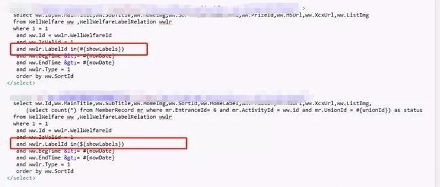 从图上可以看出 wwlr.LabelId in(${showLabels}) 和 wwlr.LabelId in(#{showLabels}),其中showLabels是传进来一个字符串类型的参数,参数的样子是这样的“4,44,514”,问题就出在这个参数传进来后#和$处理的方式是不一样的。