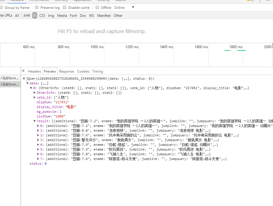 我们可以看到我们需要的 评分 名字 都被分别存放在 1.[data]-[result]-[additional] 2.[data]-[result]-[ename] 之中 。 而且每一页八部电影,分别被存在在result中的排序0-7。