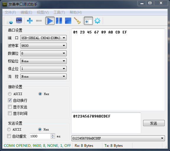 本次上位机采用友善串口助手,无校验位,停止位为1。当串口助手发送数据给FPGA后,FPGA很快又将原数据返回给上位机。