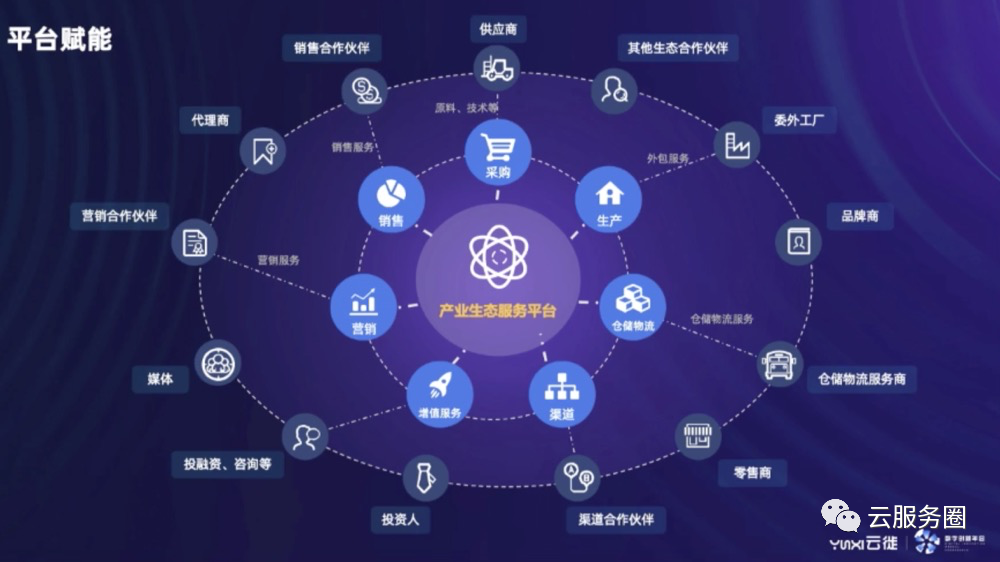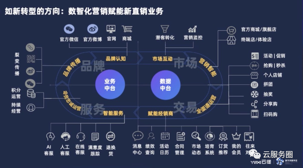 第五,云徙的中台,在面对不同企业不同的业务场景时,不需要进行全部重新开发,而是通过功能包的方式来进行能力共享。比如云徙聚焦在汽车、地产、零售、渠道、直销这5个行业,而云徙通过组装功能包的方式来满足企业不同业务板块和不同行业的需要。