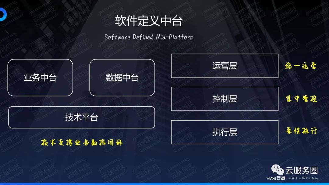 软件定义中台核心思想包含两部分:第一,明确提出了由技术平台来支撑业务中台和数据中台的闭环。第二,软件定义中台将系统空间分成三层:运营层,控制层,执行层,实现统一运营,集中管控和柔性执行。