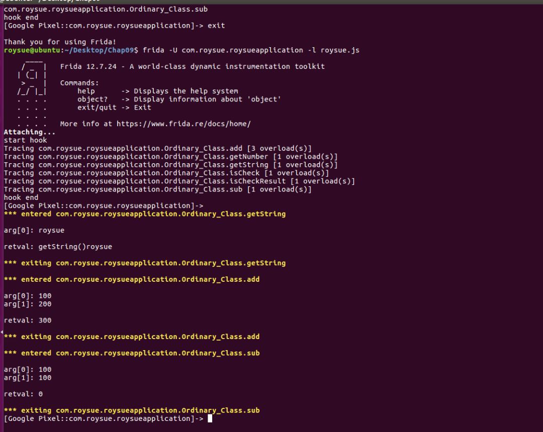 执行脚本效果可以看到,hook到了com.roysue.roysueapplication.Ordinary_Class类中所有的函数,在执行其被hook拦截的方法时候,也打印出了每个方法相应的的参数以及返回值,见下图4-22。<br><br>图4-22 终端运行显示效果