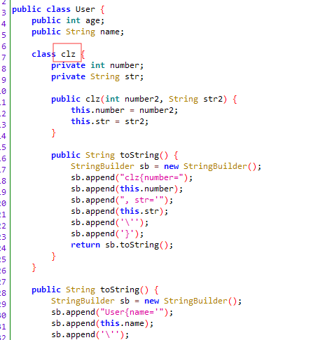 <br>图4-17 User类中的clz类<br>在图4-17中看到User类中嵌套了一个clz,这样的操作也是屡见不鲜了。在frida中,我们可以使用$符号对起进行处理。首先打开jadxgui软件对代码进行反编译,反编译之后进入User类,下方会有一个smali的按钮,点击smali则会进入smali代码,进入smali代码直接按ctrl+f局部搜索字符串clz,因为clz是内部类的名称,那么就会搜到Lcom/roysue/roysueapplication/User\$clz;,我们将翻译成java代码就是:com.roysue.roysueapplication.User\$clz,去掉第一个字符串的L和/以及;就构成了内部类的具体类名了,见下图4-18。<br>