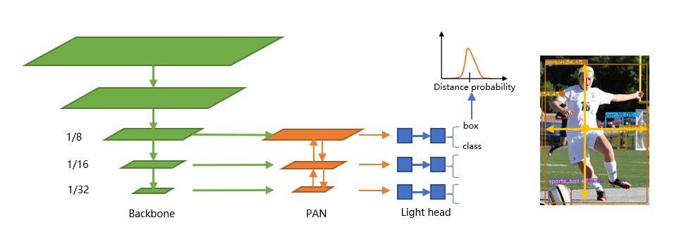 NanoDet 是一种 FCOS 式的单阶段 anchor-free 目标检测模型,它使用 ATSS 进行目标采样,使用 Generalized Focal Loss 损失函数执行分类和边框回归(box regression)。