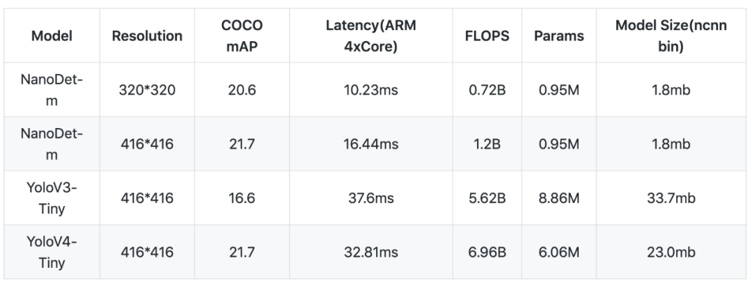 目前开源的 NanoDet-m 模型在 320x320 输入分辨率的情况下,
