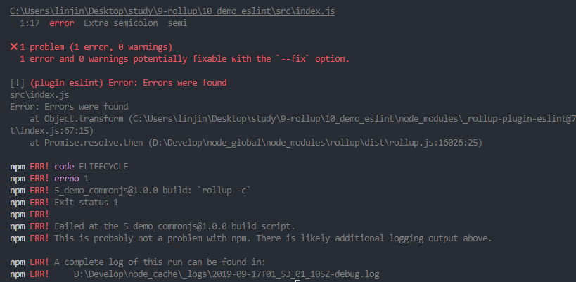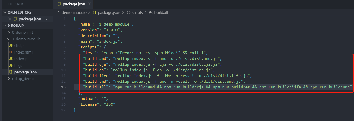 接下来我们用rollup来打包一下,在demo0中的index.js文件里将logA()改成export default logA(),然后npm init初始化一个package.json,并在package.json文件中写好不同模块的打包命令