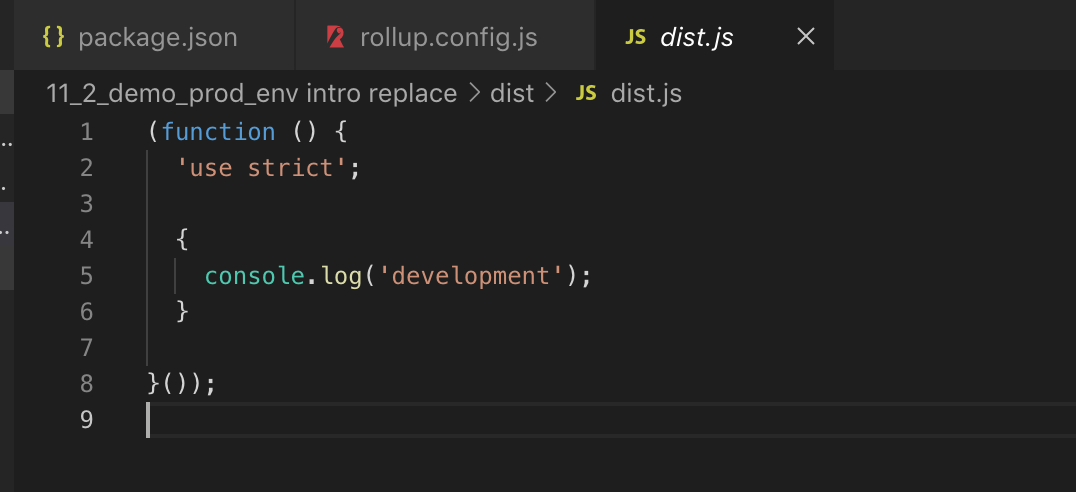 有时候我们会把开发/生产环境的信息直接写在源文件里面,这个时候用intro来注入代码的方式就不适合了。这个时候我们就需要使用rollup-plugin-replace插件来对源代码的变量值进行替换: