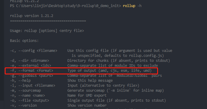 那么我们先来看下模块输出的几种格式,我们使用rollup -h查看下