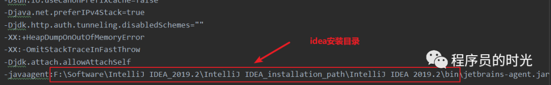 在打开的vmoptions编辑窗口末行添加:-javaagent:你idea的安装目录\jetbrains-agent.jar