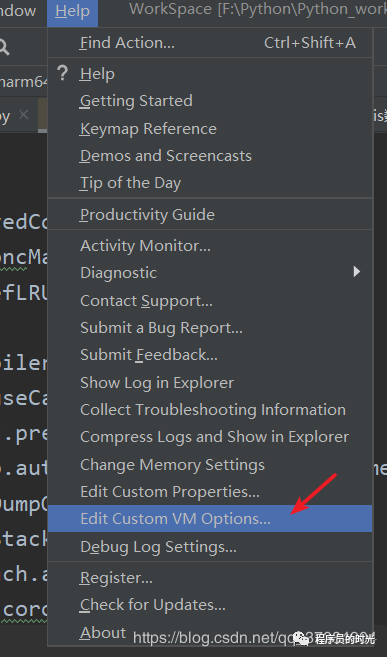 进入到项目界面后,点击idea最上面的菜单栏中的 “Help” -> “Edit Custom VM Options …”。