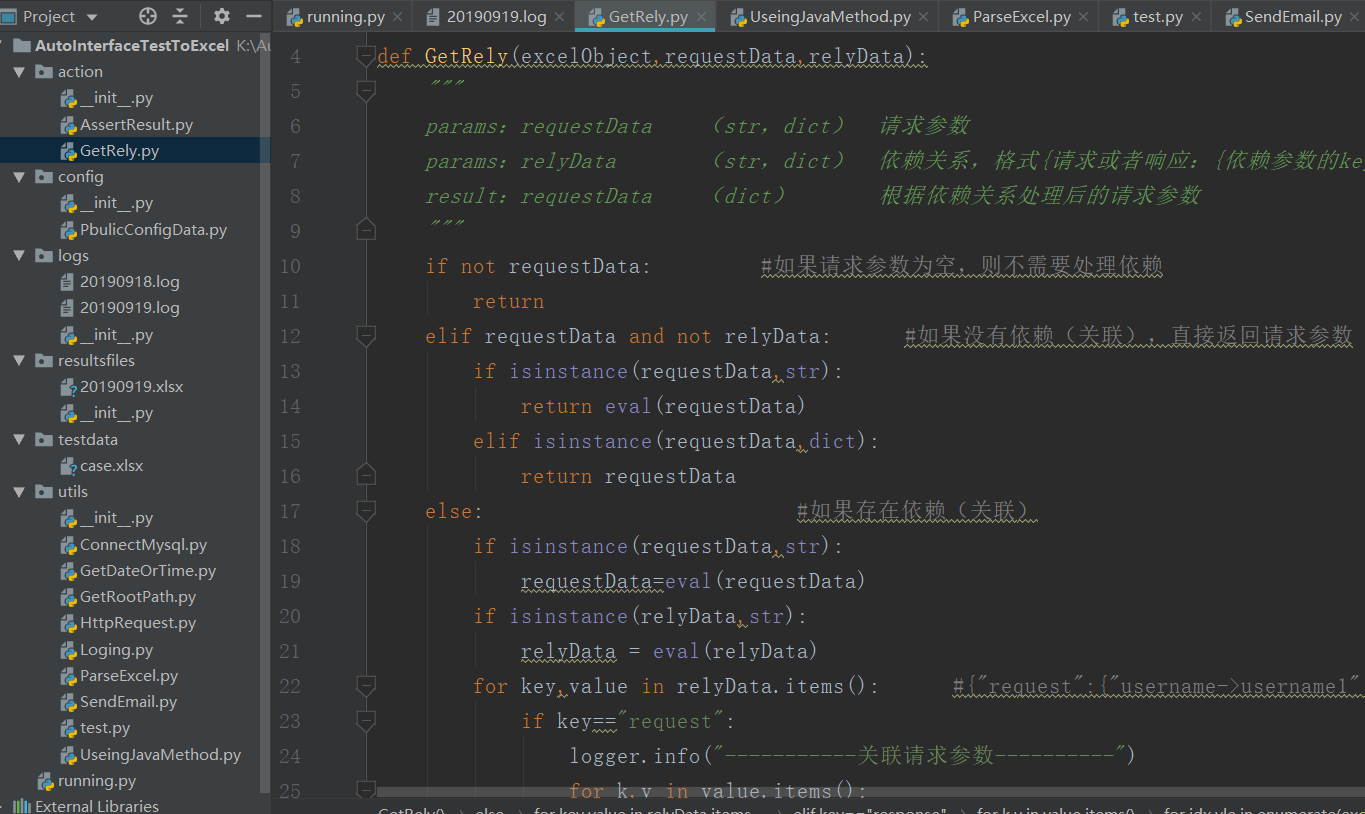 处理关联关系》拼接请求url及参数》发送请求》断言用例是否通过》写入结果内容》发送邮件