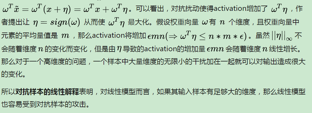 一个简单的线性模型可以有对应的对抗样本如果它的输入有足够多的维度
