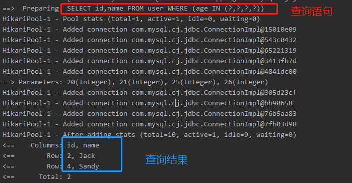 11 System.out.println(("----- 查询年龄为20、21、25、26的用户,且只返回id和name字段 ------"));