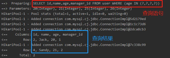 11 System.out.println(("----- 查询年龄为20、21、25、26的用户,且只返回id、name、manager_id 字段 ------"));