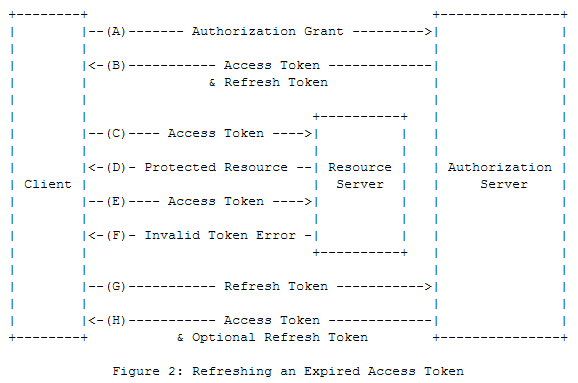 - (H) 授权服务器对客户端进行身份认证并校验刷新令牌,如果校验通过,则发放新的访问令牌(并且,可选的发放新的刷新令牌)