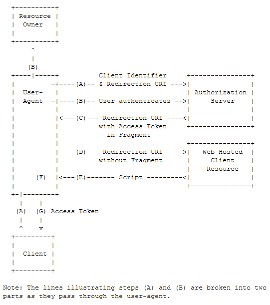 - (E) web-hosted客户端资源返回一个web页面(典型的,内嵌脚本的HTML文档),并从片段中提取访问令牌。