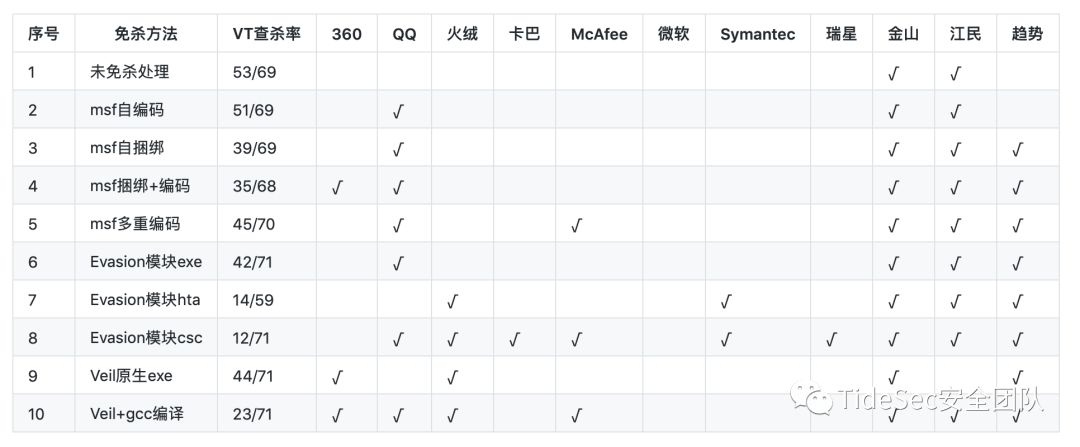 1、下表中标识 √ 说明相应杀毒软件未检测出病毒,也就是代表了Bypass。
