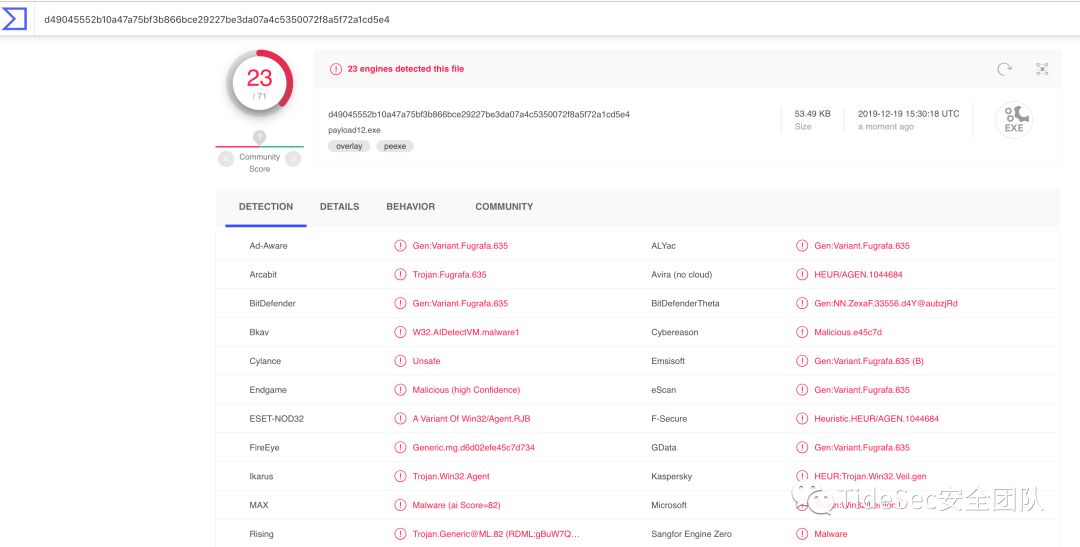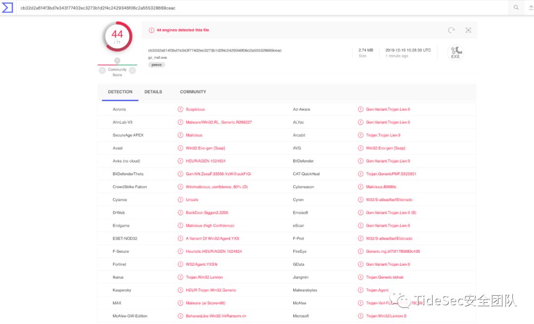 4、其他杀软的检测指标是在virustotal.com(简称VT)上在线查杀,所以可能只是代表了静态查杀能力,数据仅供参考,不足以作为免杀的精确判断指标。