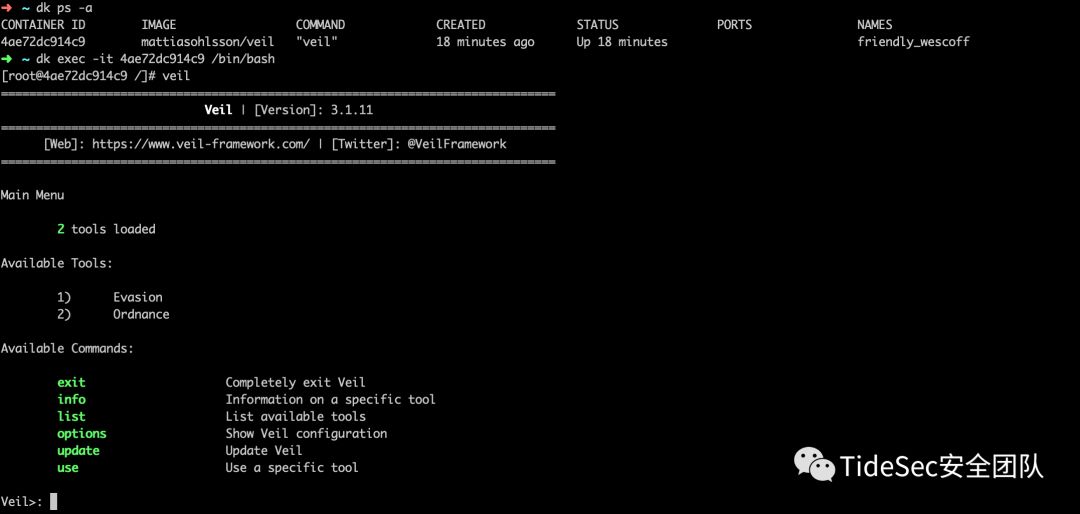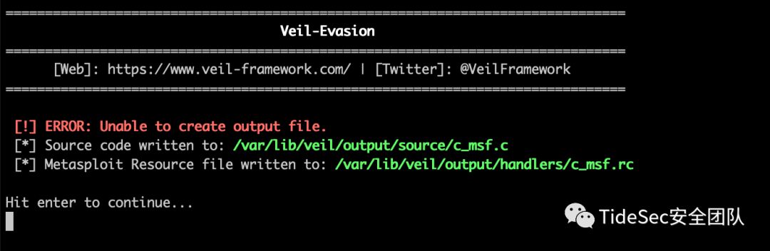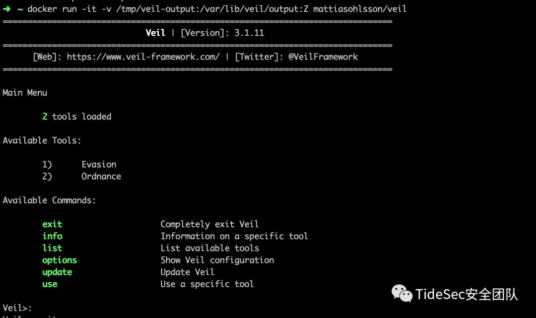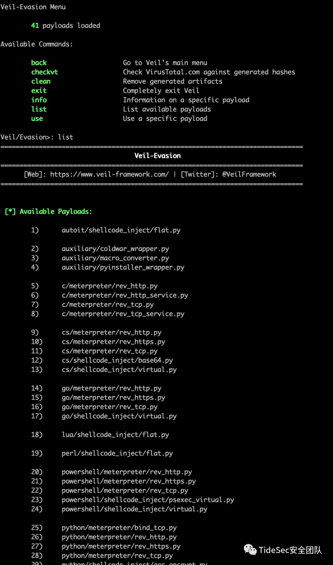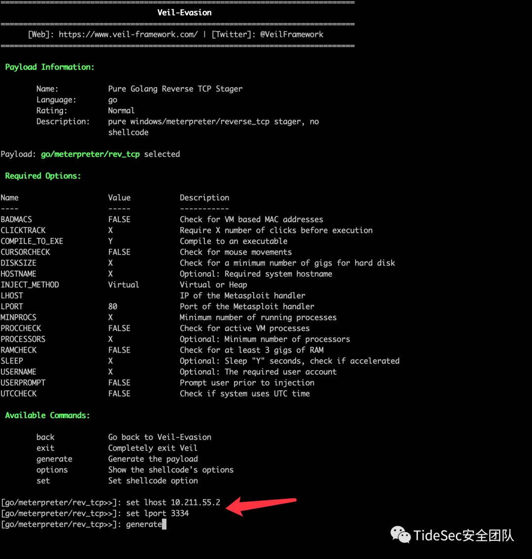 -v /tmp/veil-output:/var/lib/veil/output:Z是将宿主机的/tmp/veil-output目录映射到docker里面,这样veil生成的payload可以直接在宿主机里使用。