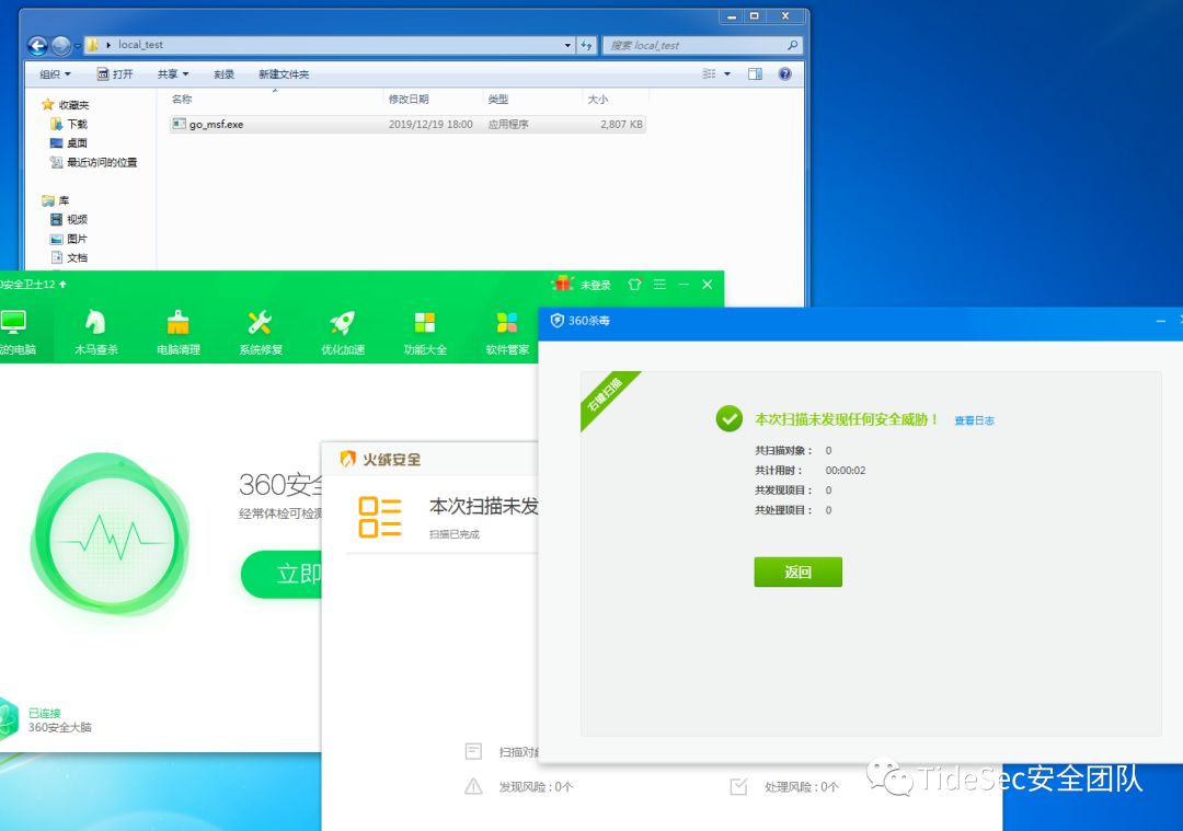 3、由于本机测试时只是安装了360全家桶和火绒,所以默认情况下360和火绒杀毒情况指的是静态+动态查杀。360杀毒版本5.0.0.8160(2019.12.12),火绒版本5.0.33.13(2019.12.12),360安全卫士12.0.0.2001(2019.12.17)。