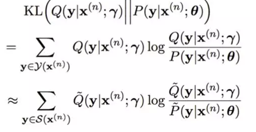 下图展示了文中KL散度的计算公式。其中为源语句的所有可能的候选翻译的集合,是采样子空间。在训练过程中不可能穷尽所有可能的翻译,因此采用近似的方法,采样一部分可能的翻译进行 KL 散度的估计。[1]